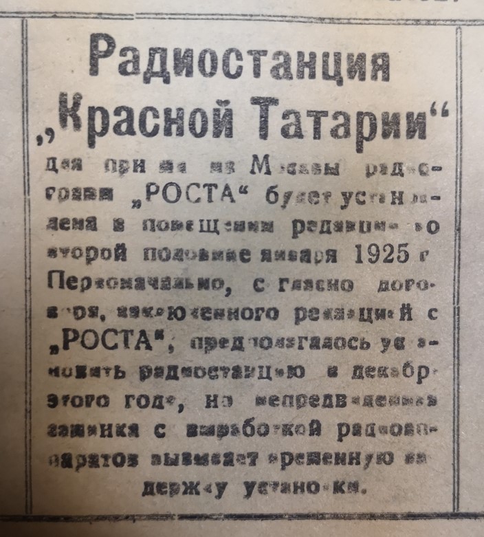 Инновационная новость под конец года – в январе 1925 года в помещении редакции «Красной Татарии» будет установлена радиостанция для приёма из Москвы радиограмм РОСТА (Российское телеграфное агентство)