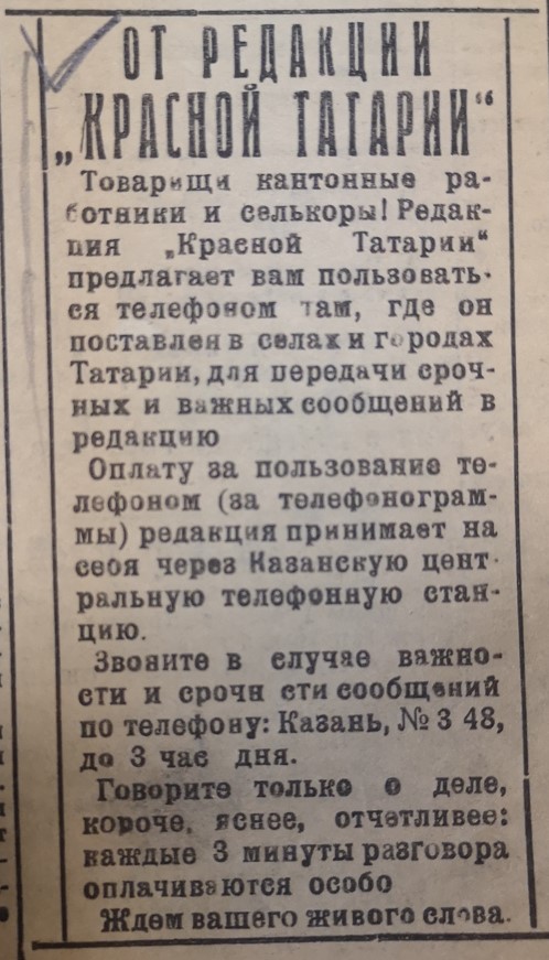 Интересно, как в нашу газету приходила информация с мест в ту пору. В специальном объявлении от редакции «Красной Татарии» рабочим и сельским корреспондентам предлагается пользоваться телефоном для передачи срочных и важных сообщений. Оплату редакция принимала на себя, а звонить следовало по номеру 348 (да, тогда хватало всего трёх цифр) до трёх часов дня. Любопытно и уточнение: «Говорите только о деле, короче, яснее, отчётливее: каждые три минуты разговора оплачиваются особо. Ждём вашего живого слова». Кстати, только за четыре месяца по газетным сообщениям было возбуждено 16 уголовных дел, которые готовятся к судебным процессам. А ещё по 200 случаям прокуратура реагировала и отправляла запросы в организации или приглашала нерадивых лиц к себе для «разбора полётов». Таким образом, «око государево» внимательно следило за сообщениями с мест, которые появлялись в «Красной Татарии», и реагировало на них.