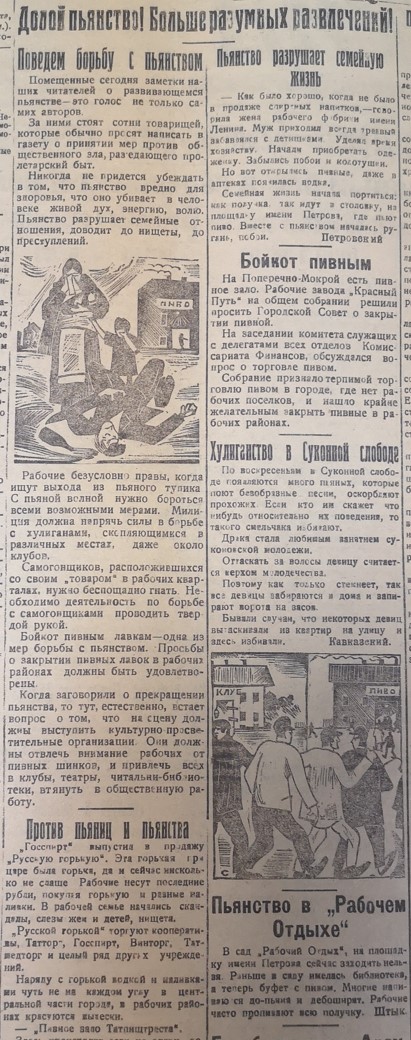 В Суконной слободе неспокойно – по воскресеньям там появляется много пьяных, которые поют безобразные песни, оскорбляют прохожих. Если кто им скажет что-нибудь относительно их поведения, то такого смельчака избивают. Драка стала любимым занятием молодёжи слободы. В качестве меры борьбы предлагается бойкот пивных лавок. И в то же время сообщается, что Госспирт выпустил в продажу «Русскую горькую». В рабочих районах красуются вывески «Пивное зало Татпищтреста» – в подобных заведениях напиваются до потери сознания. Пьют рабочие, торговцы, крестьяне, девицы и даже коммунисты, которые не отстают от общей массы. Рабочие несут последние рубли, покупая горькую и разные сладкие наливки. В семьях – скандалы, слёзы жён и детей, нищета. Такая вот рисуется печальная картина.
