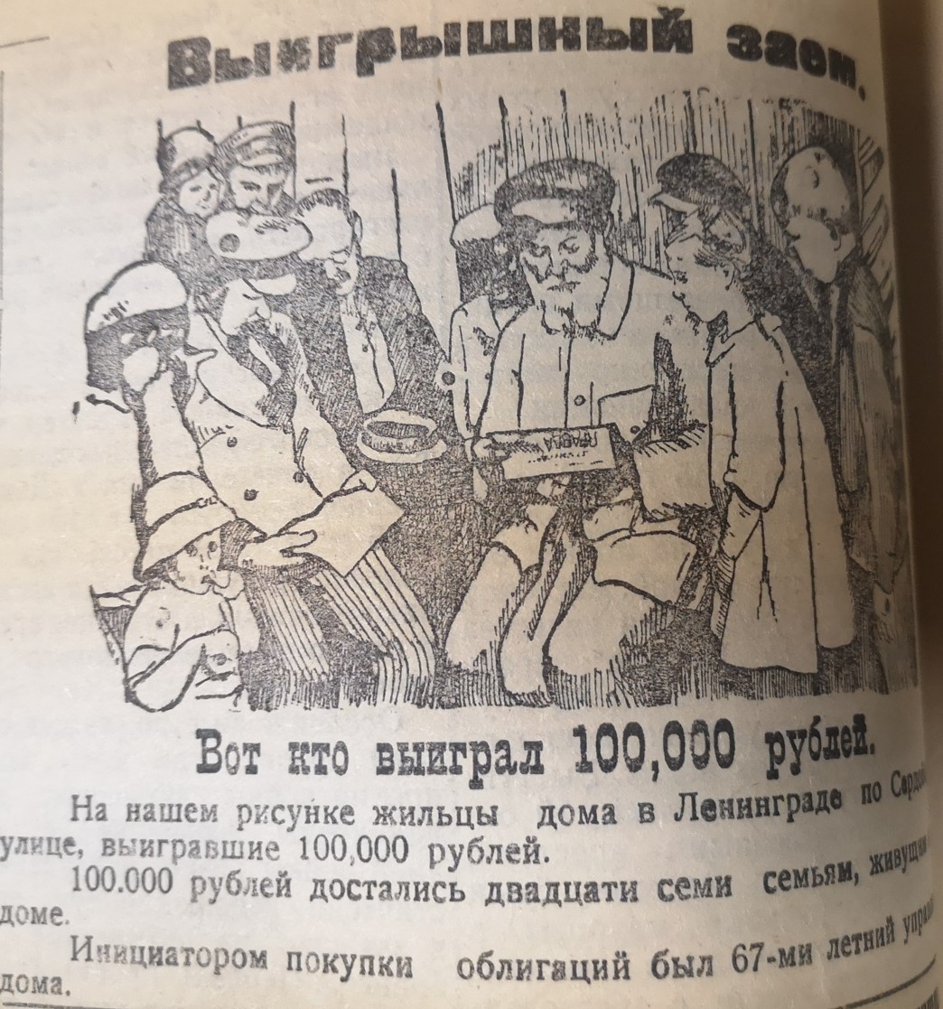 Взрослые и дети склонились над газетой «Правда». Заголовок над рисунком: «Вот кто выиграл 100 тысяч рублей». На изображении показаны жильцы дома в Ленинграде, выигравшие столь крупную сумму. В итоге 100 тысяч целковых достались 27 семьям. А инициатором покупки выигрышной облигации был 67-летний управляющий домом.