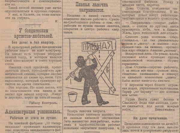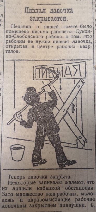 Заколоченная дверь, и мужчина с кистью и краской замазывает надпись «Пивная». Такой рисунок иллюстрировал заметку о закрытии пивной в Суконной слободе, где проживало много рабочих. Некоторые запивалы жалеют, что их лишили кабацкой обстановки. Зато множество жён выпивох, молодёжь и здравомыслящие рабочие довольны закрытием пивнушки.