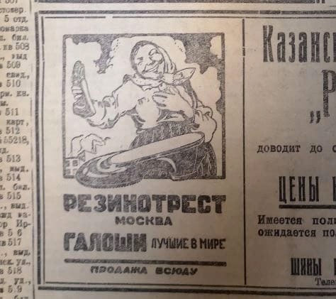 И ещё один пример рекламы: широко улыбающаяся женщина в платке держит в руке блестящую галошу. Подпись к рисунку: «Резинотрест Москвы – лучшие в мире галоши. Продажа всюду».