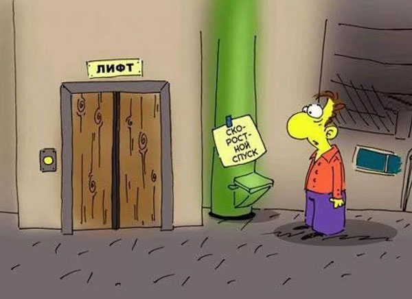 Вышел я с утра на работу, вызвал лифт – не едет. Сломался. Спустился пешком, вызвал по телефону дежурного лифтёра, уехал на работу. Вечером жена рассказала дальнейшую историю со слов бабушки-соседки.