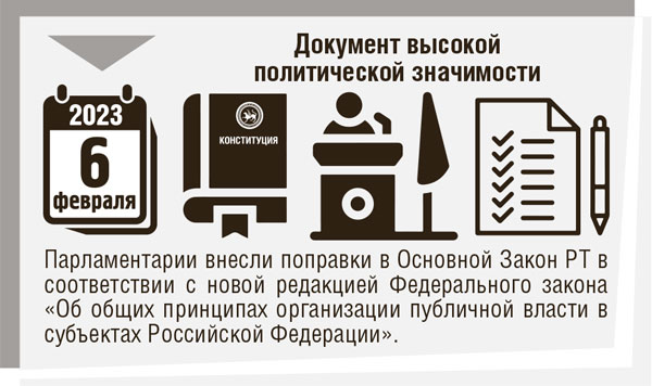 Депутаты республиканского парламента на первом заседании весенней сессии внесли поправки в Основной Закон РТ в cвязи с принятием новой редакции Федерального закона «Об общих принципах организации публичной власти в субъектах Российской Федерации». Одним из новшеств стало переименование должности Президента РТ. Согласно закону новое наименование высшего должностного лица РТ – «Глава (Раис) РТ». По оценке Председателя Госсовета Фарида Мухаметшина, получился документ, учитывающий прежде всего интересы и благополучие жителей республики. Изменения вносятся в шесть разделов, включающих 60 статей Конституции республики (подробно ознакомиться с содержанием поправок можно на сайте Госсовета РТ).