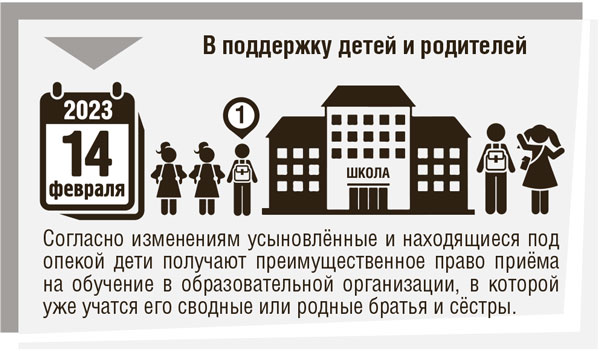 Закон Республики Татарстан №3-ЗРТ от 3 февраля 2023 года «О внесении изменений в статью 45 Семейного кодекса Республики Татарстан и статью 14 Закона Республики Татарстан «Об образовании» вступил в силу 14 февраля 2023 года. Документ в части преимущественного права приёма на обучение в образовательные организации усыновлённых детей и детей, находящихся под опекой в семье, разработан в целях приведения республиканского законодательства в соответствие с федеральным аналогом. Согласно изменениям усыновлённые и находящиеся под опекой дети получают преимущественное право приёма на обучение в образовательной организации, в которой уже учатся их сводные или родные братья и сёстры.