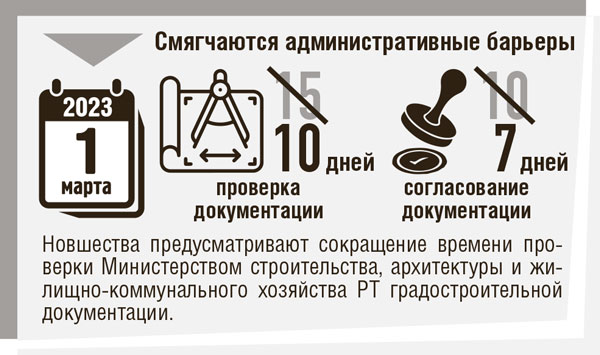 Закон РТ №5-ЗРТ от 3 февраля 2023 года «О внесении изменений в статью 18 Закона РТ «О градостроительной деятельности в Республике Татарстан» вступил в силу 1 марта 2023 года. Новшества предусматривают сокращение времени проверок Министерством строительства, архитектуры и жилищно-коммунального хозяйства РТ документации на соответствие градостроительным требованиям – с 15 до 10 рабочих дней, а также с 10 до 7 рабочих дней срока согласования такой документации с органами исполнительной власти РТ. Предлагаемые изменения вносятся в соответствии с положениями Градостроительного кодекса РФ.
