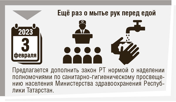 Закон №6-ЗРТ «О внесении изменений в статьи 3 и 5 Закона Республики Татарстан «О санитарно-эпидемиологическом благополучии населения», принятый 26 января 2023 года, вступил в силу 3 февраля 2023 года. В соответствии с федеральным законодательством документом предлагается дополнить закон РТ нормой о наделении полномочиями по санитарно-гигиеническому просвещению населения органа исполнительной власти Республики Татарстан.