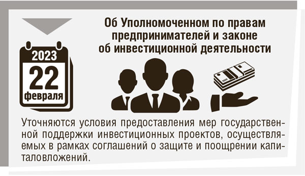 На заседании Госсовета 22 февраля 2023 года в первом чтении и в целом были приняты законопроекты о внесении изменений в республиканские законы об Уполномоченном по защите прав предпринимателей и об инвестиционной деятельности. Оба законопроекта разработаны в связи с необходимостью совершенствования правовых норм.
