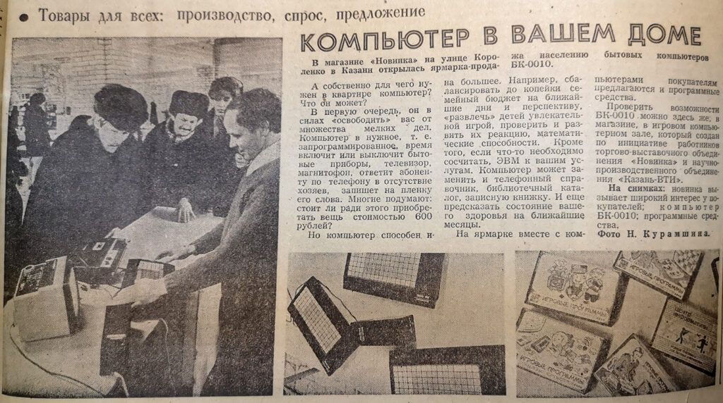 Ностальгию вызывает реклама 1988 года компьютера БК-0010, который в народе называли «бэкашка». Такой можно было приобрести в магазине «Новинка» на улице Короленко в Казани. На фото мужчины в меховых шапках с интересом разглядывают сам компьютер, подключенный к нему телевизор (на него выводилось изображение) и магнитофон, с которого на «бэкашку» закачивались программы).