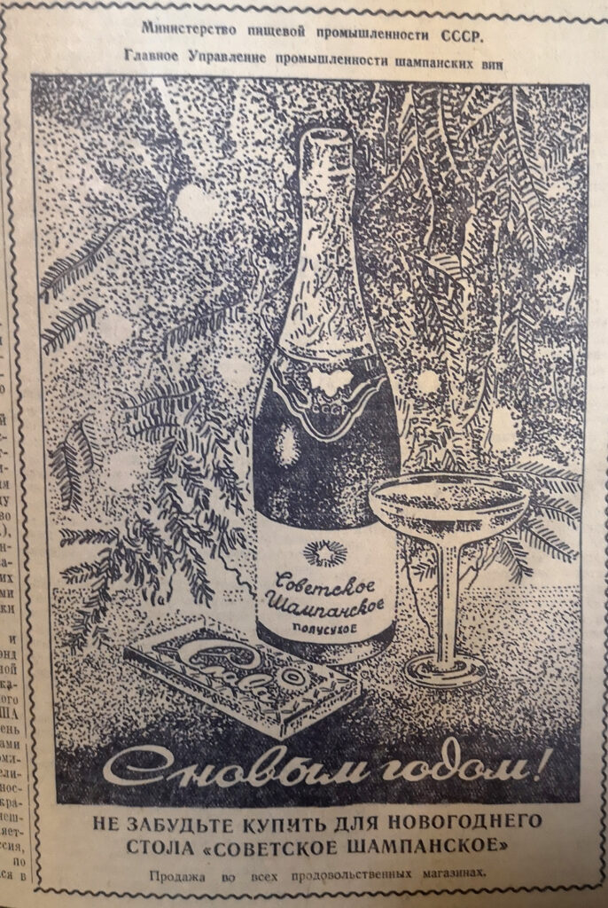 В конце 1952 года реклама от Министерства пищевой промышленности СССР и Главного Управления промышленности шампанских вин в нашей газете призывает купить для новогоднего стола «Советское шампанское».
