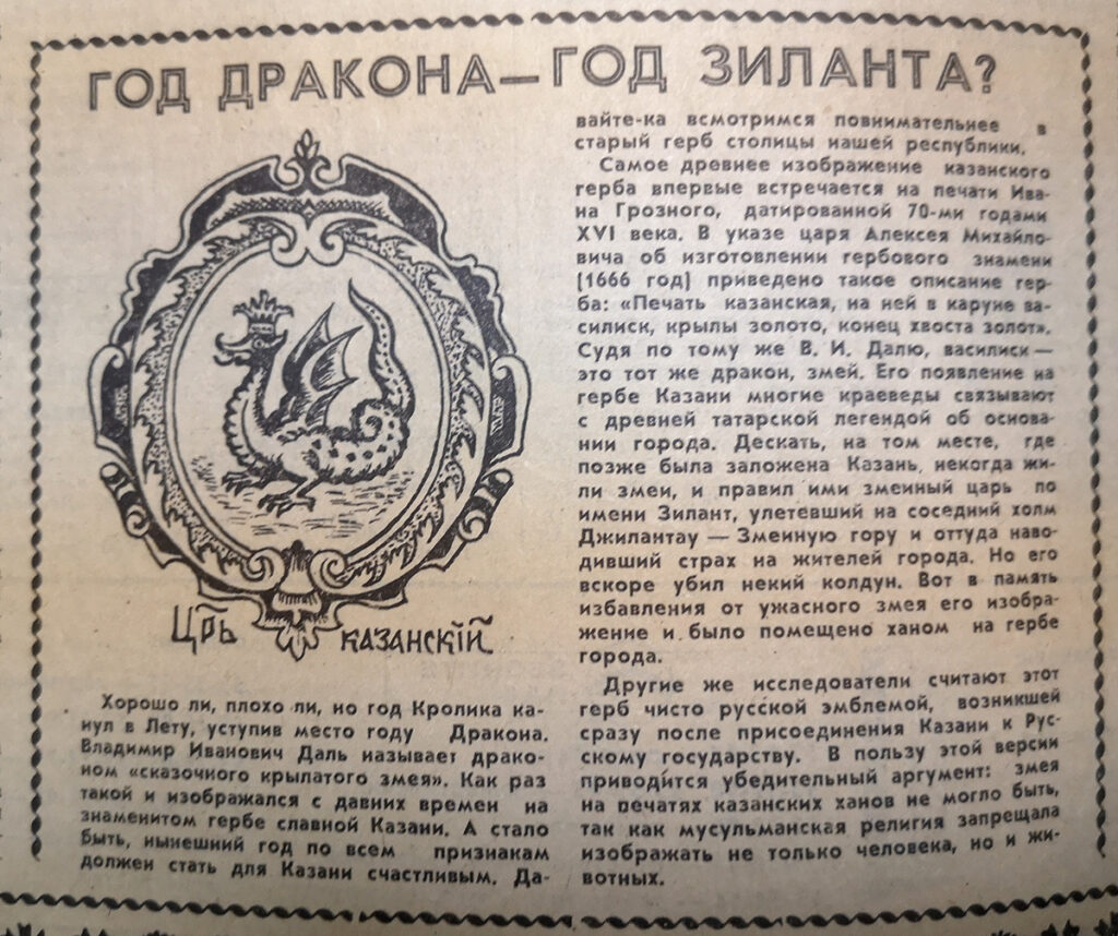 «Год Дракона — год Зиланта?» - под таким заголовком вышла заметка, посвященная мифическому зверю, изображенному на гербе Казани.