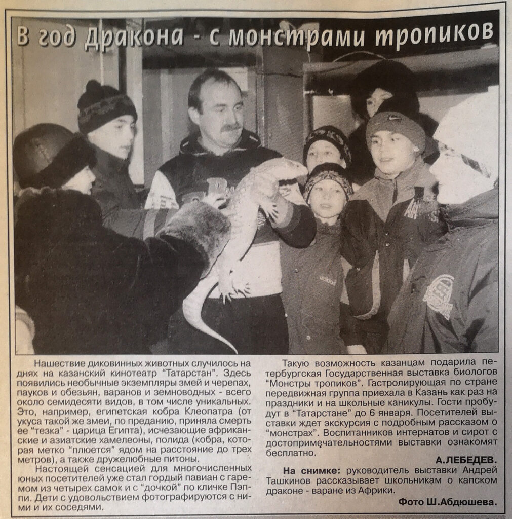 В статье «В год Дракона — с монстрами тропиков» рассказывается о передвижной выставке диковинных животных, которая приехала в Казань из Питера. Среди экспонатов – змеи, черепахи, пауки, египетская кобра Клеопатра (по легенде от укуса такой змеи приняла смерть царица Египта) — всего около 70 видов.