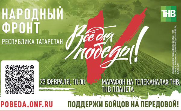 Помогают Российской армии и миллионы рядовых сограждан. В День защитника Отечества на республиканских телеканалах «ТНВ» и «ТНВ Планета» состоится патриотический марафон в рамках всероссийской акции «Всё для Победы!». Его инициатор – региональное отделение Общероссийского Народного фронта в Татарстане.