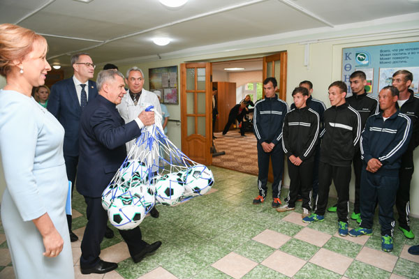 Рустам Минниханов подарил спортсменам новые футбольные мячи.
