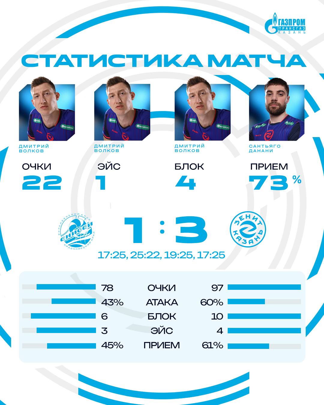 Волейболисты казанского «Зенита» в Красноярске обыграли местный «Енисей» со счетом 3:1 по партиям.