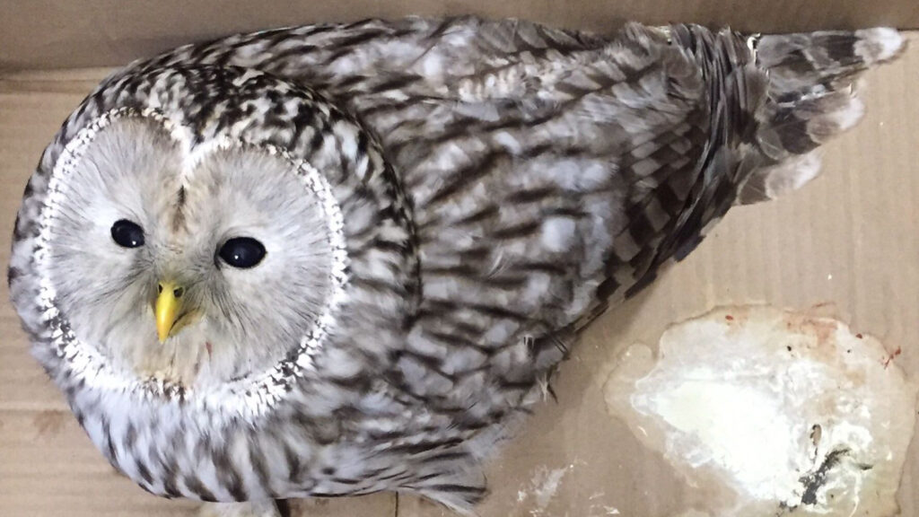 Они оперативно выехали на место и осмотрели птицу. Во время осмотра выяснилось, что у неясыти повреждена лапа и она не может летать.
