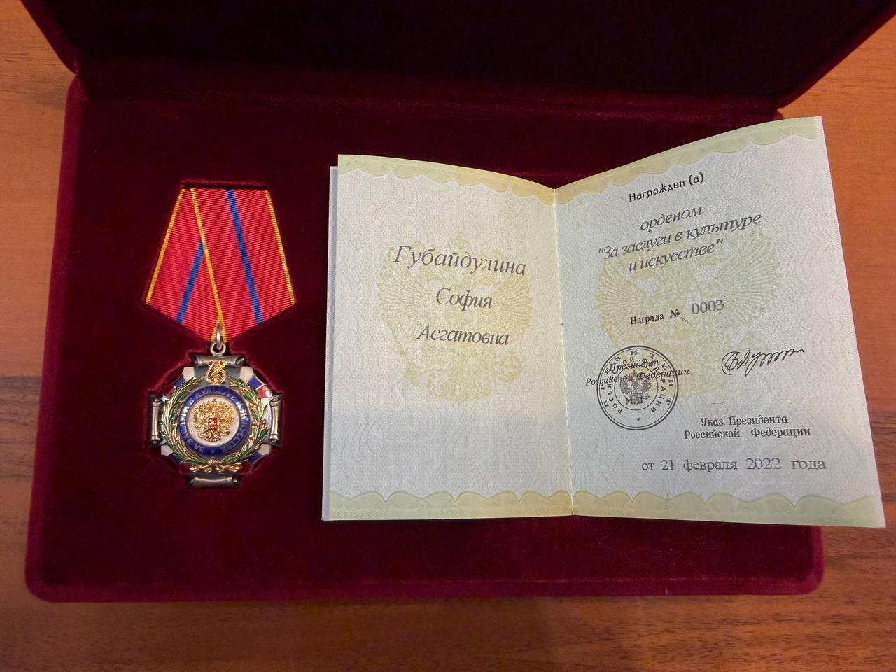 Среди переданных предметов – орден «За вклад в культуру и искусство Российской Федерации», врученный композитору в 2022 году, а также «Золотой лев» Венецианской биеннале – престижная награда, полученная ею в 2013 году за вклад в современную музыку. Кроме того, в коллекцию вошли татарские серебряные украшения (серьги и колье), янтарные бусы, наручные часы, окарина (духовой музыкальный инструмент) и другие личные вещи. Особое место занимает фотопортрет отца композитора – Асгата Масгудовича Губайдулина. Этот снимок – не просто семейная реликвия, а напоминание о корнях и о той духовной линии, которая во многом определила характер творчества выдающегося композитора современности.
