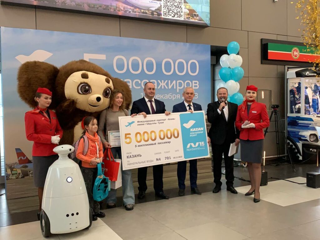 Первым пассажиром, который стал символическим 5-миллионным, оказалась Анастасия Данилова, летевшая из Казани в Минеральные Воды вместе со своей семьей. Ее встретили праздничным фейерверком и тортом генеральный директор аэропорта Сергей Романцов и заместитель гендиректора авиакомпании Nordwind Антон Маттис.